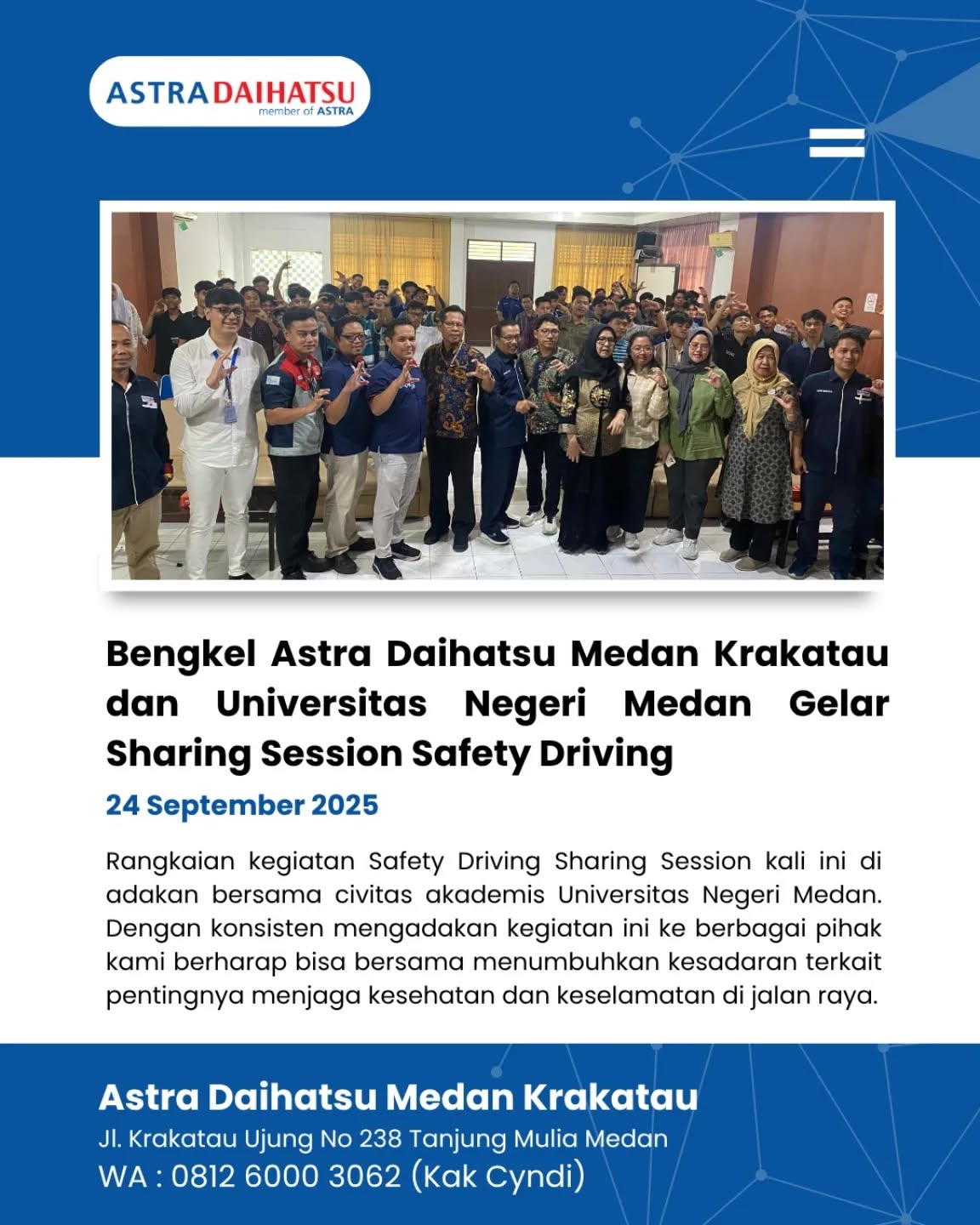 Melanjutkan kegiatan serupa pada batch ini Bengkel Astra Daihatsu Medan Krakatau mengadakan Sharing Session berkaitan Safety Driving bersama civitas akademis Universitas Negeri Medan. Kegiatan yang dihadiri oleh Pimpinan, Dosen, Staff dan Mahasiswa ini dilaksanakan pada tanggal 24 September 2025 di Aula Fakultas Teknik Universitas Negeri Medan. Pada kegiatan ini Bengkel Astra Daihatsu Medan Krakatau juga mengadakan pemeriksaan kendaraan dan uji emisi Gratis bagi civitas Unimed. Keselamatan berkendara di jalan merupakan tanggung jawab bersama, oleh karena itu Astra Daihatsu Medan Krakatau berharap kolaborasi antara kedua belah pihak dapat memberikan kontribusi positif bagi semua Customer Daihatsu dan warga Medan pada umumnya.