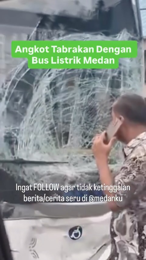 Menurut pengirim video: “kejadian dari medan labuhan hari ini, Selasa, 7 Oktober 2025, kejadian menyebabkan jalan macet. Bus listrik depan nya hancur dan bagian angkot belakangnya hancur”