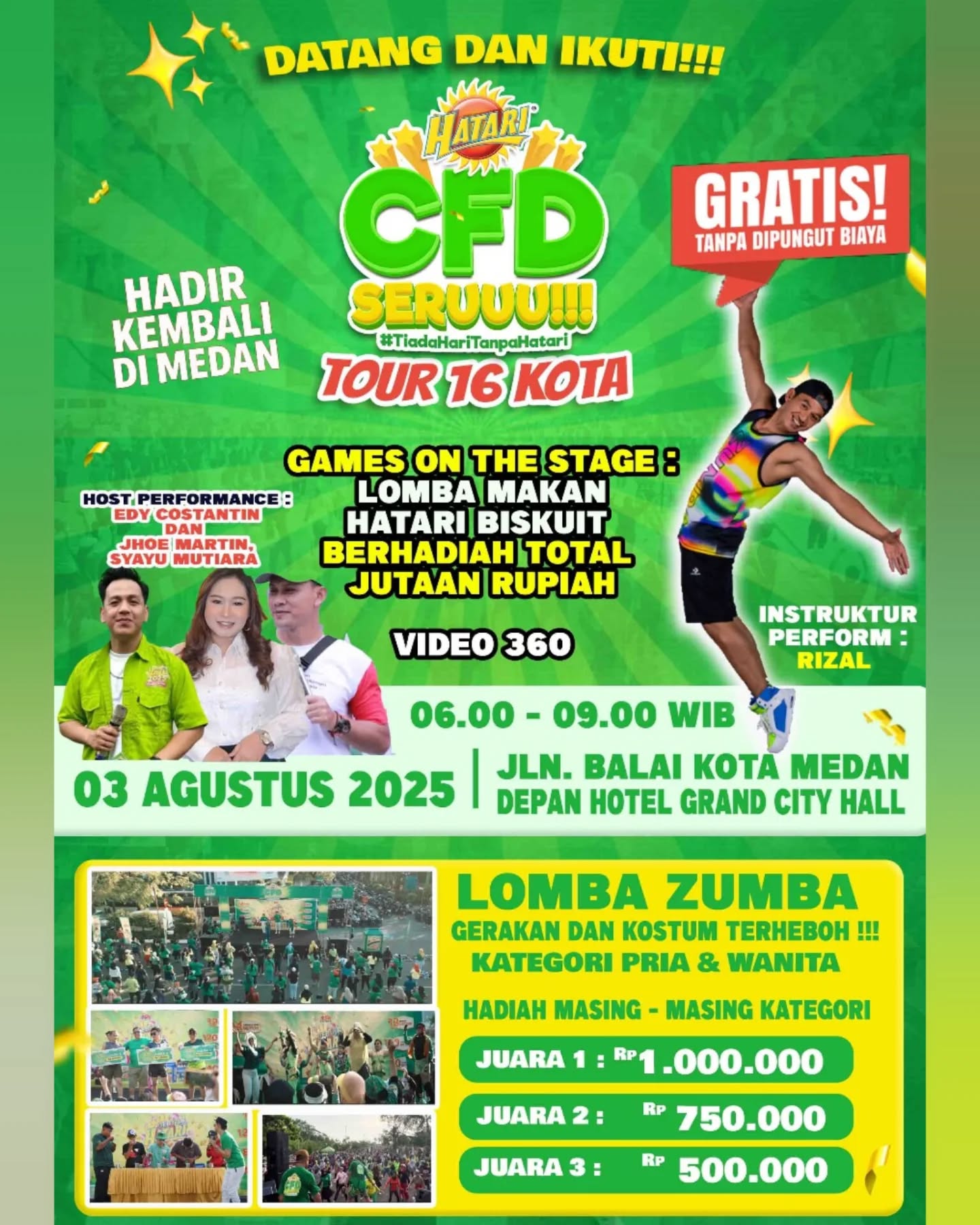 Ayo kita seru-seruan di hari Minggu nanti! Ada acara CFD SERUUU bersama Biskuit Hatari di KOTA MEDAN π€©