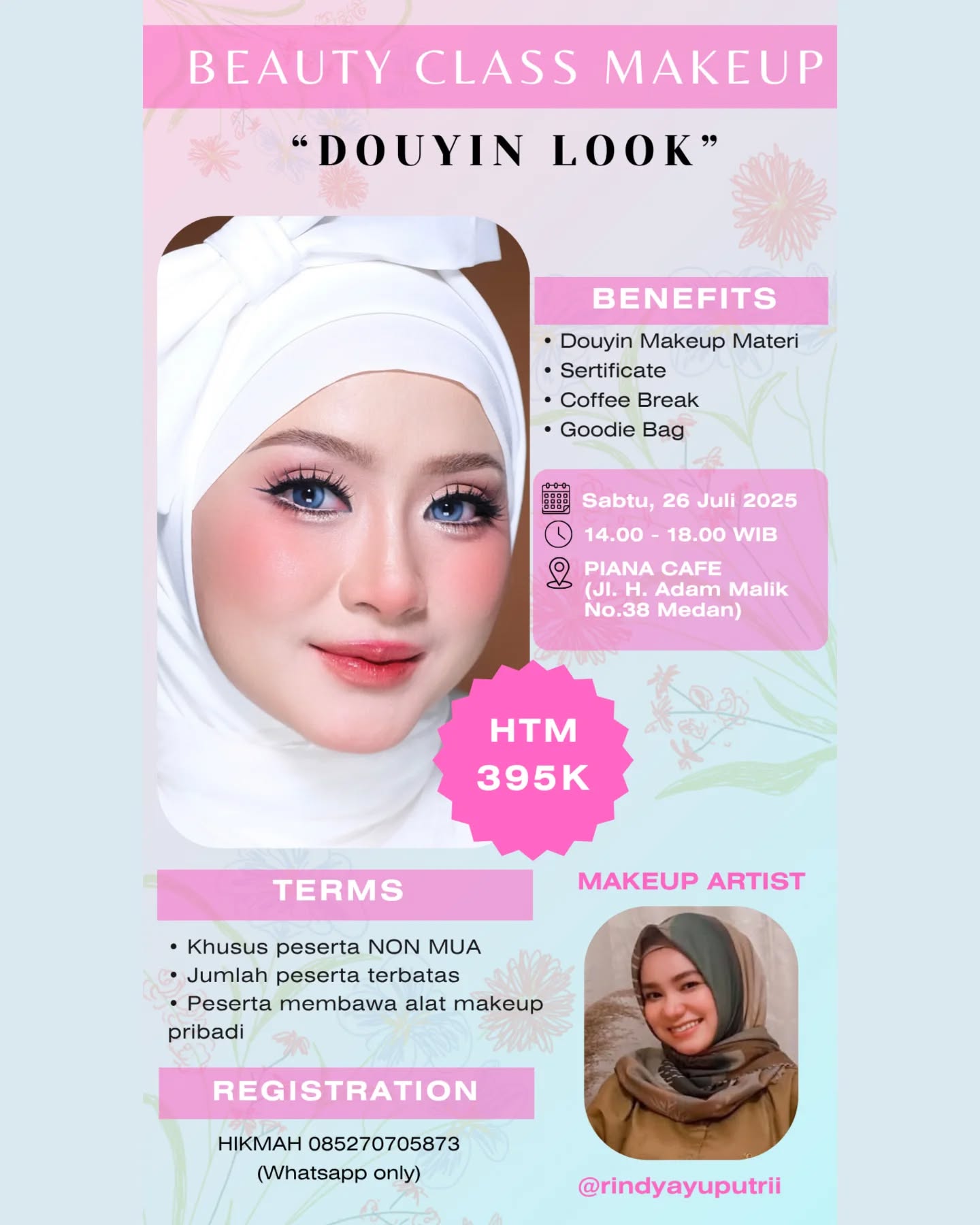 Ini kesempatan buat kamu yang mau level-up skill makeup ke Douyin Makeup yang lagi hits di sosial media. Dan selama acara, kamu juga dibebaskan untuk tanya jawab seputar makeup. Jadi jangan lupa daftarkan diri kamu segera yaaa. Karena slot juga terbatas ️