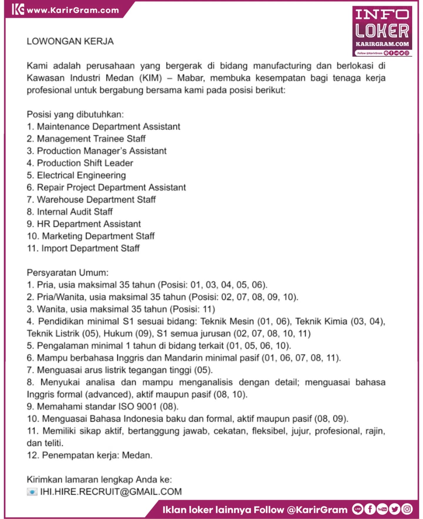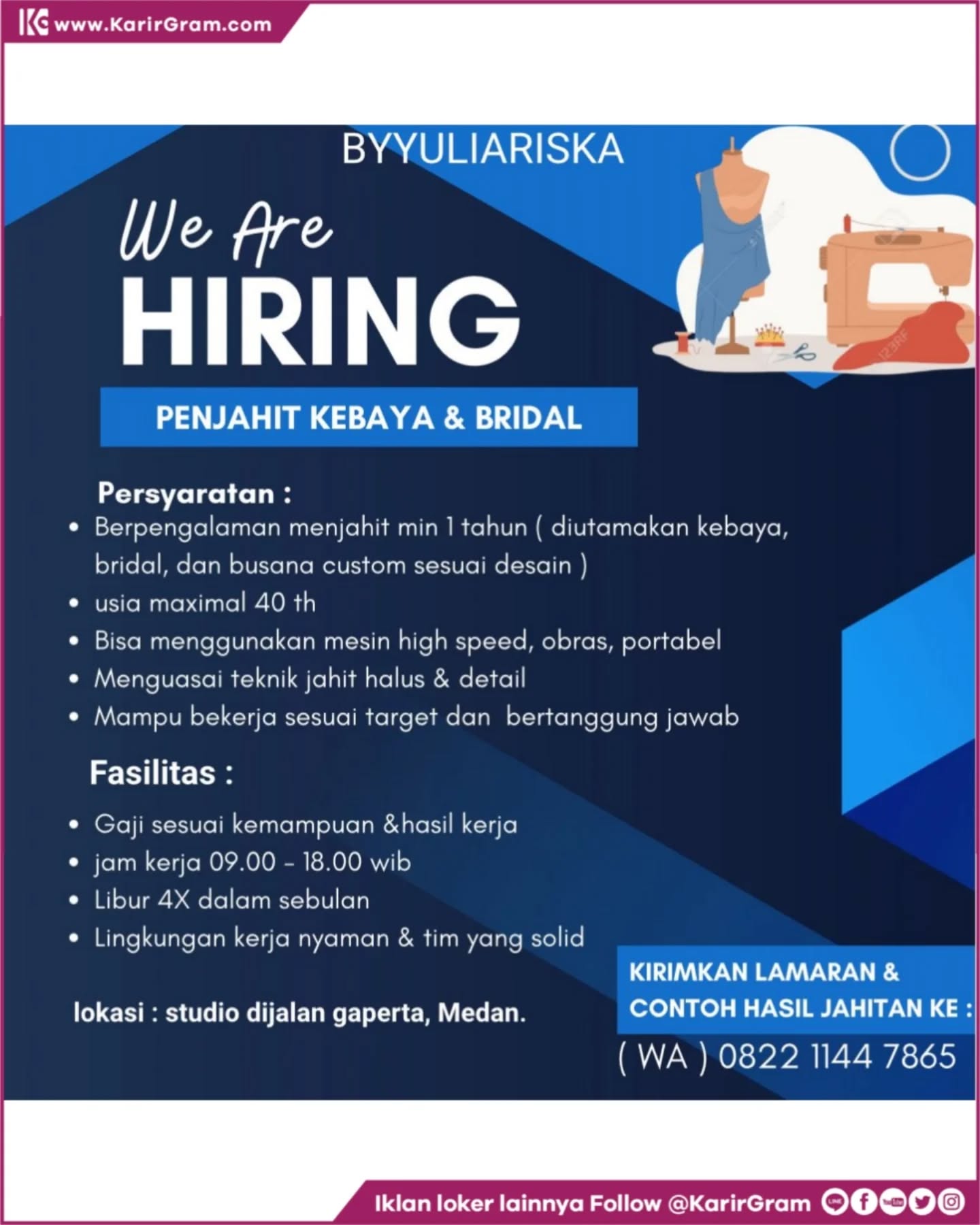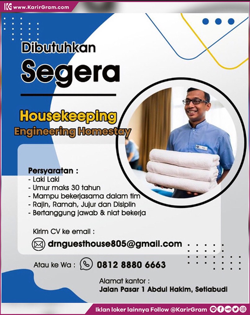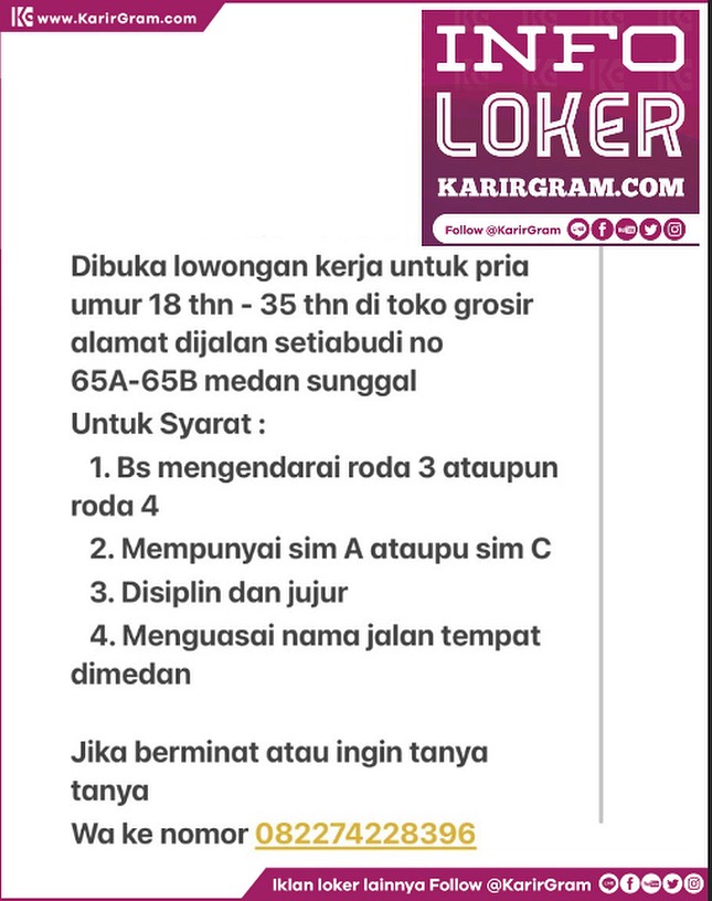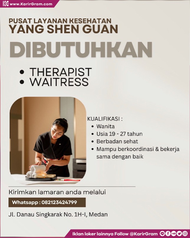 Cerita Medan & SUMUT: Lowongan Kerja Pusat Layanan Kesehatan Yang Shen Guan Posisi : 01. Therapist 02. Waitress Kriteria : * Wanita * Usia 19 – 27 tahun * Berbadan sehat * Mampu berkoordinasi & bekerja sama dengan baik Lamaran dapat dikirimkan ke : WhatsApp 0821 2342 4799 •• Waspada Penipuan Loker yang suruh bayar/top-up […]